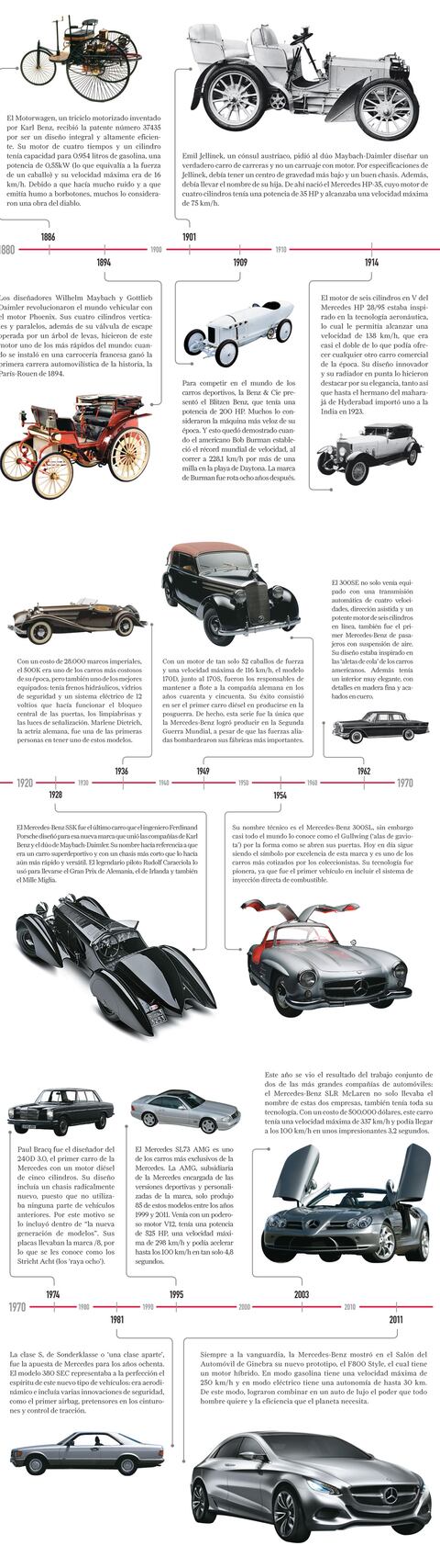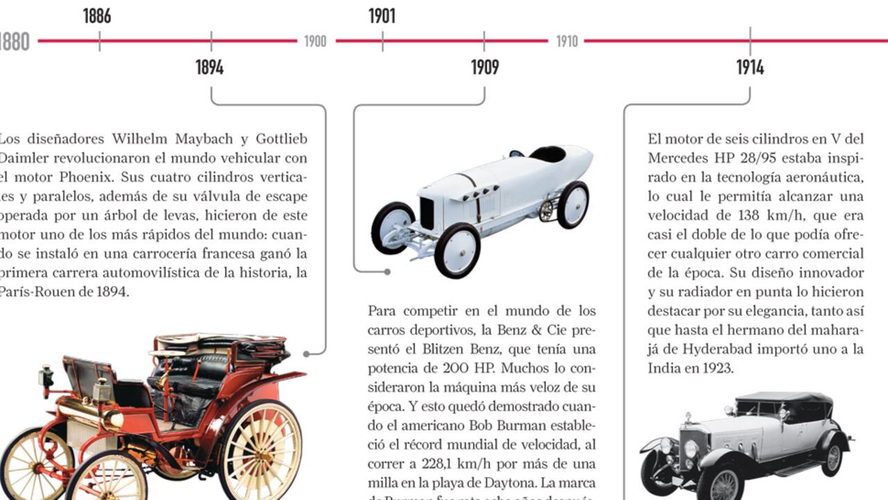 Desde que era un simple cerrajero, Karl Benz quería construir un “carruaje sin caballos”. Y logró cumplir su sueño cuando en 1886 terminó el Motorwagen, el primer vehículo de gasolina en ser patentado en la historia. Por esa misma época, Gottlieb Daimler y Wilhelm Maybach ya habían diseñado un motor aún más potente, que habían instalado en una lancha y en una bicicleta. Independientemente de cuál de ellos haya sido el inventor del carro, lo más impresionante fue que estos señores solucionaron, paralelamente y sin conocerse entre sí, el mismo problema: transmitir la potencia del motor de combustión interna a un vehículo para calle. Y, de paso, sentaron las bases para la creación de uno de los íconos de elegancia e innovación del mundo automovilístico: la Mercedes-Benz.