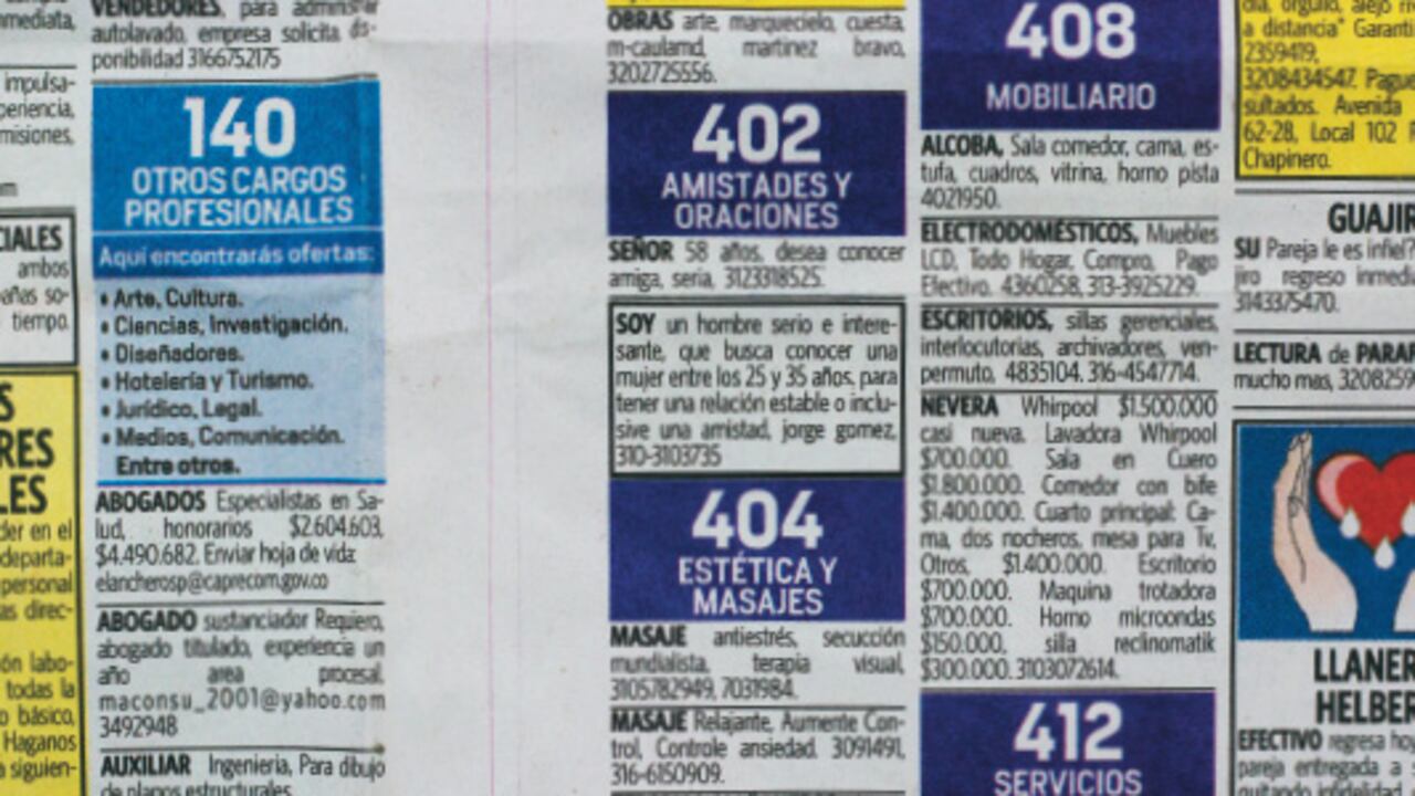 En el fin de semana recibo más llamadas. Empiezo a responderlas. Hay una de un teléfono fijo. Es Yolanda. “¿Cuántos años tienes?”. “45”, le digo, quitándome dos años, por si acaso. Yolanda suelta una severa carcajada. “¿Muchos?”. “No, mijo, un sardino, si supiera mi edad”. “¿Cuántos años tienes?”. “La gente, cuando me ve, no cree que tenga la edad que tengo”. “¿Como Amparo Grisales?”. “No se ría que la vida sana hace milagros. Es que yo soy masajista alternativa”. Yolanda me describe los masajes que hace, me habla del estrés de la ciudad, del trabajo y del que producen “las llamadas de los bancos”. Me habla de energías. “Yolanda, ¿tú estás buscando venderme un masaje o de verdad quieres un amigo?”. “Mire, yo soy muy clara, muy directa. Yo sé que todos los hombres que ponen esos avisos lo que están buscando es una moza. Pero yo sí quiero un amigo. Un amigo es algo muy importante. Ya casi no hay amigos”. “Yolanda, ¿cuántos años tienes?”. “60”. “¿Pero eres delgada?”. “¿Por qué mejor no se busca una modelo?”. Me cae bien Yolanda. Nos despedimos en buenos términos. Creo que voy a hacerme un masaje alternativo con ella. Y no es caro: cuesta $45.000.