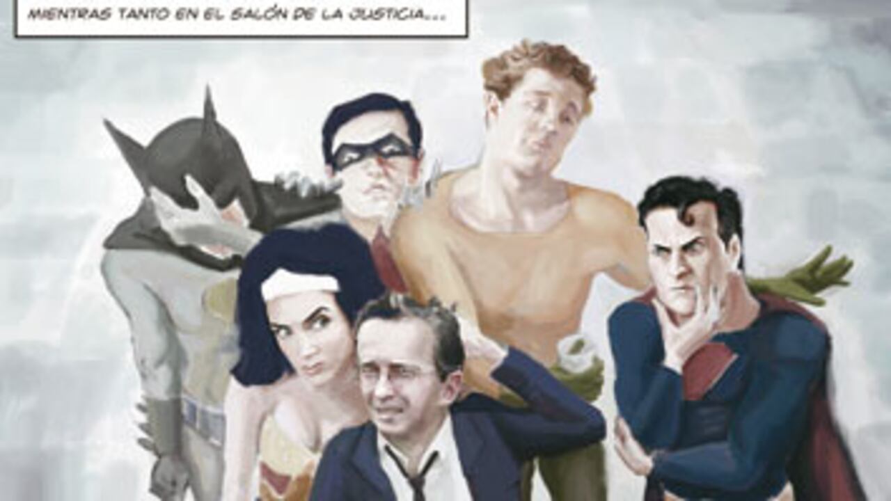 A los quince minutos apareció en el lugar Alicia Arango con dos tarrados de gotas para el estrés y Juan Manuel Santos rodeado de periodistas alegando tener pruebas de que el Hombre Halcón era amigo de las Farc. La llegada de sus asesores más cercanos tranquilizó a Uribe, quien dijo que semejante pelotera le recordaba las reuniones del Partido de la U, pero que seguía decidido en convencer a los superhéroes de su carácter indispensable para la supervivencia del Salón de la Justicia.