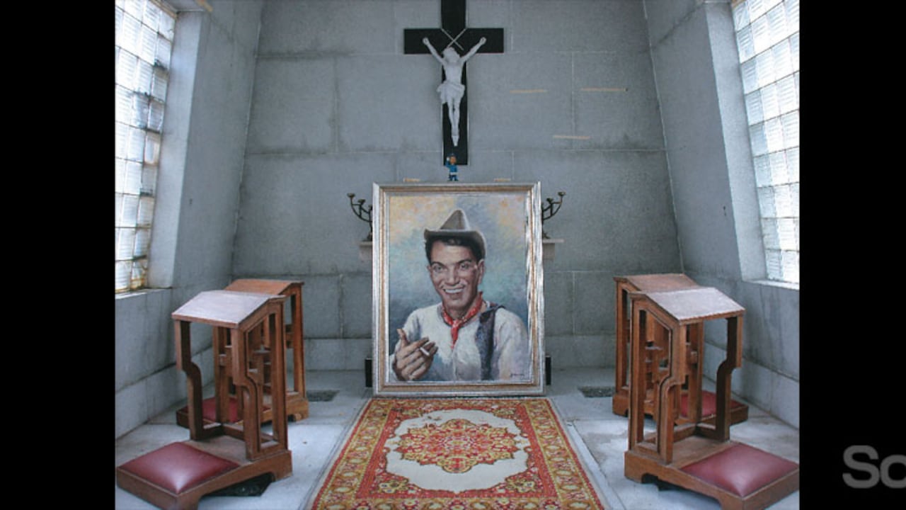 La construcción de cemento tiene paredes que imitan las piedras incas, con incrustaciones de vidrio transparente para que la luz llegue al interior durante el día. Una cruz de cemento pintada de negro resalta nítidamente en la parte superior de la capilla. Tiene un letrero encima de la puerta: Mario Moreno "Cantinflas". Ninguna inscripción alude a la esposa. Adentro, un cuadro del cómico —caracterizando a su famoso personaje, con una sonrisa fácil, pañoleta al cuello y el sombrero raído de paño— nos recuerda que sus cenizas descansan en esta cripta. La puerta es de aluminio y está cerrada. A cada lado, hay dos ramos de flores que el hijo mandó colocar para nuestra visita. Deben tener un par de días. Están empezando a marchitarse.